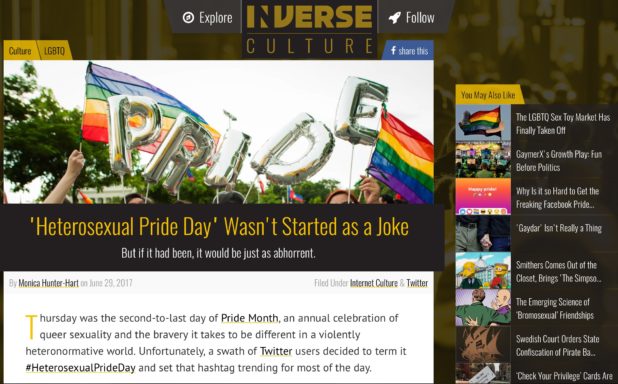 “Inverse Magazine” is the perfect name for a bizarro-world publication that feigns outrage at people not being rug-munchers and corn-holers.