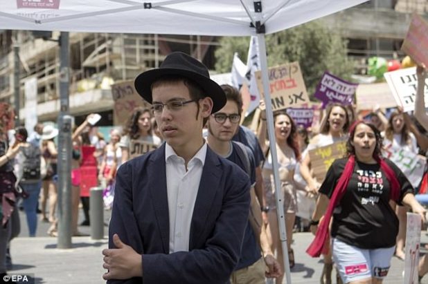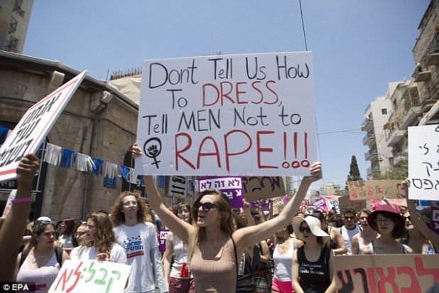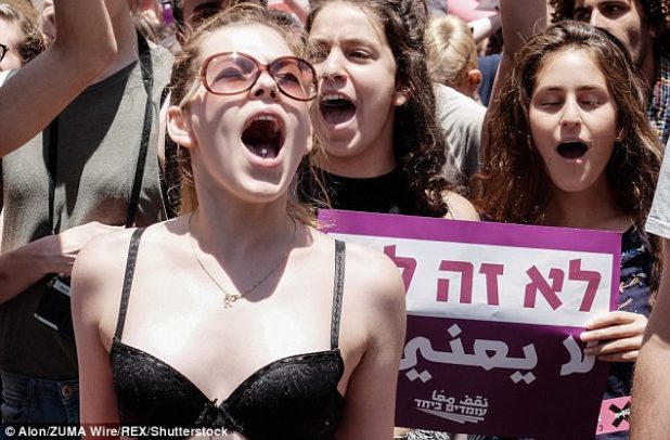 ‘No, that means no,’ they chanted this year as the marchers, mostly women but also some men, made their way along Jaffa Road and near religiously conservative Ultra-Orthodox Jewish areas such as Mahane Yehuda where women cover up in long robes.