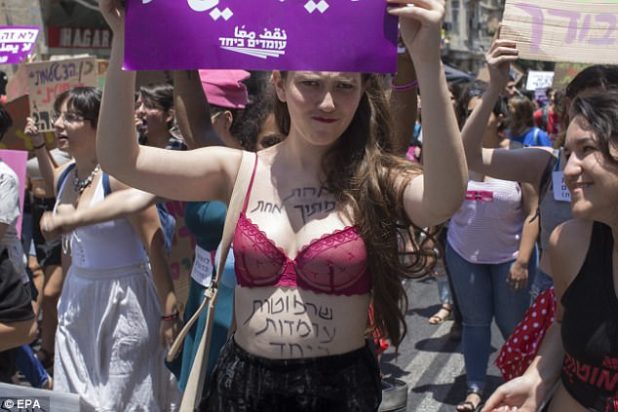 This was the scene as Israeli women shed their clothes to take part in a ‘Slut Walk’ demonstration through the streets of Jerusalem.