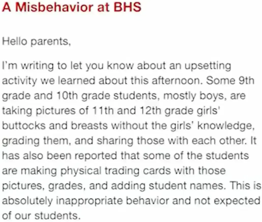 The principal added that parents should “let your teen know that I take this sexual harassment very seriously and there is no place for it in our community.”