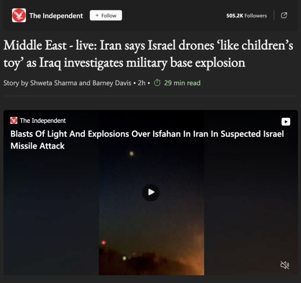 Basically, a couple of drones were shot down in a small Iranian city, and then the entire Western media started claiming that Israel had delivered some kind of devastating attack on Iran. Yesterday morning, there was still a “fog of war,” and it was unclear what exactly the “attack” was. Iran was downplaying it completely, but I noted that they might have reason to do that even if it was a significant attack.
