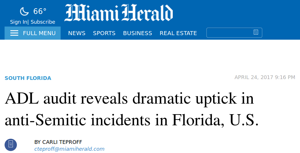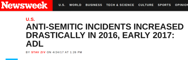 In its Annual Audit of Anti-Semitic incidents, the civil rights organization found 541 acts of vandalism, violence and harassment against American Jews already reported in 2017. This recent increase follows last year’s total of 1,266 acts, by the organization’s count, a 34 percent spike over 2015.