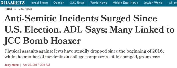 Surprise, surprise – the only media that is being honest about this is the Israeli media, which is openly admitting that this new campaign by the ADL to push this “rising anti-Semitism” is based on including the Jewish hoaxes in their numbers – and that physical attacks are actually DROPPING.
