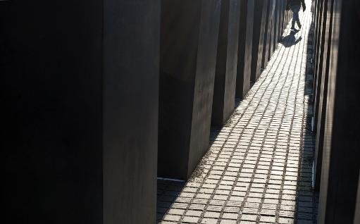 A person walks past concrete steles at the Holocaust Memorial in Berlin, on January 31, 2012