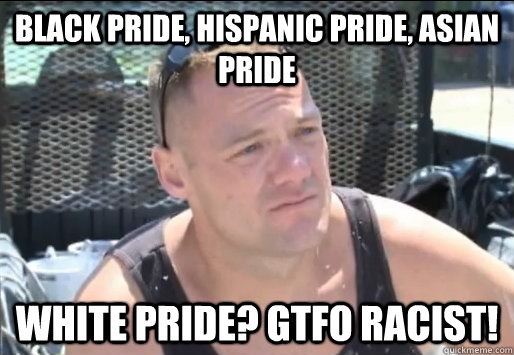 “I’m tired of hiding the real me. I”m a White Racist. I was born that way. It is as much a part of me as my skin color, my bone structure, my hair, my eyes and my heterosexuality. So, I don’t want none of them haters and bigots comin’ my way to try to reeducate me or deprogram me, or brainwash me, or condition me, or counsel me out of who and what I am. We are racist from birth.