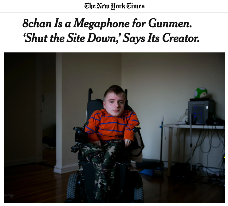 People are mad that Hotwheels, the founder of 8chan who sold it a couple years ago to Jim Watkins, told the New York Times he wanted 8chan shut down.