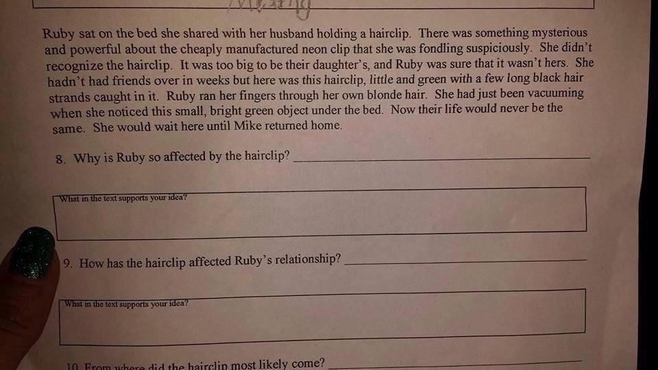 Ruby sat on the bed she shared with her husband holding a hairclip. There was something mysterious and powerful about the cheaply manufactured neon clip that she was fondling suspiciously. She didn’t recognize the hairclip. It was too big to be their daughter’s, and Ruby was sure that it wasn’t hers. She hadn’t had friends over in weeks, but here was this hairclip, little and green with a few long black hair strands caught in it. Ruby ran her fingers through her own blonde hair. She had just been vacuuming when she noticed this small, bright green object under the bed. Now their life would never be the same. She would wait here until Mike returned home.
