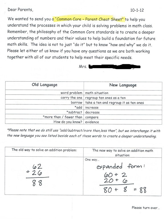 And old terms such as “add” and “subtract” are out. As you can see from the “Common Core – Parent Cheat Sheet” posted below, our kids are now learning how to “increase” and “decrease”…