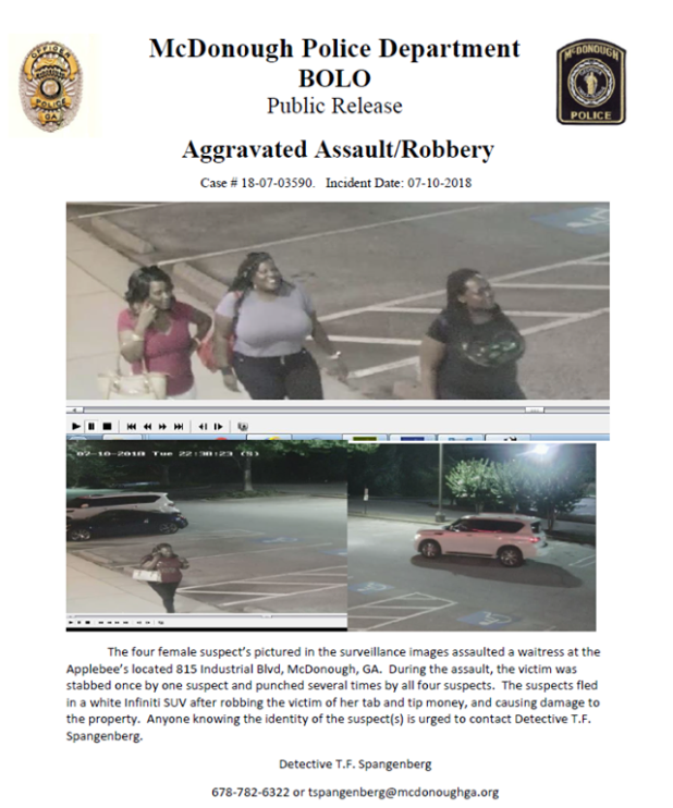 The women beat and punched the waitress and stabbed her in the forearm with a steak knife, McDonough police Maj. Kyle Helgerson told AJC.com. They allegedly took her tip money before they skipped out on a $62.57 bill.