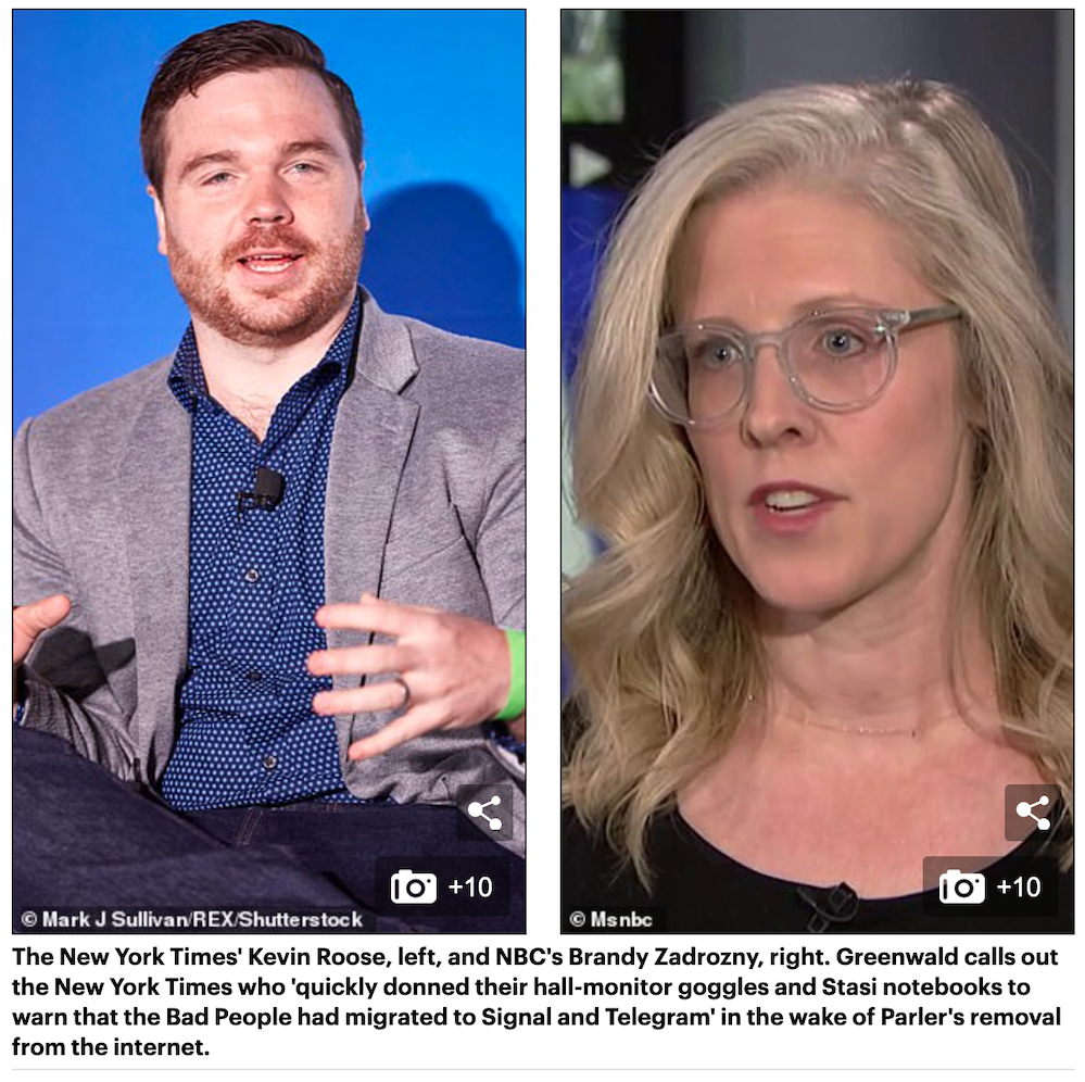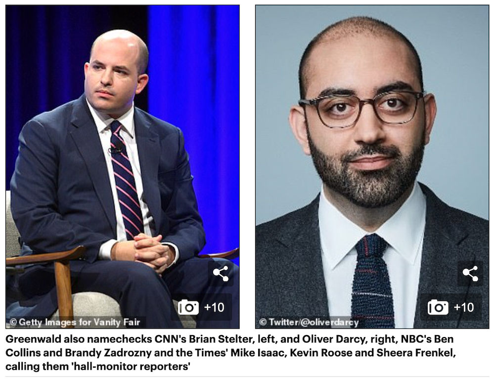 I’ve written before about one particularly toxic strain of this authoritarian “reporting.” Teams of journalists at three of the most influential corporate media outlets — CNN’s “media reporters” (Brian Stelter and Oliver Darcy), NBC’s “disinformation space unit” (Ben Collins and Brandy Zadrozny), and the tech reporters of The New York Times (Mike Isaac, Kevin Roose, Sheera Frenkel) — devote the bulk of their “journalism” to searching for online spaces where they believe speech and conduct rules are being violated, flagging them, and then pleading that punitive action be taken (banning, censorship, content regulation, after-school detention). These hall-monitor reporters are a major factor explaining why tech monopolies, which (for reasons of self-interest and ideology) never wanted the responsibility to censor, now do so with abandon and seemingly arbitrary blunt force: they are shamed by the world’s loudest media companies when they do not.