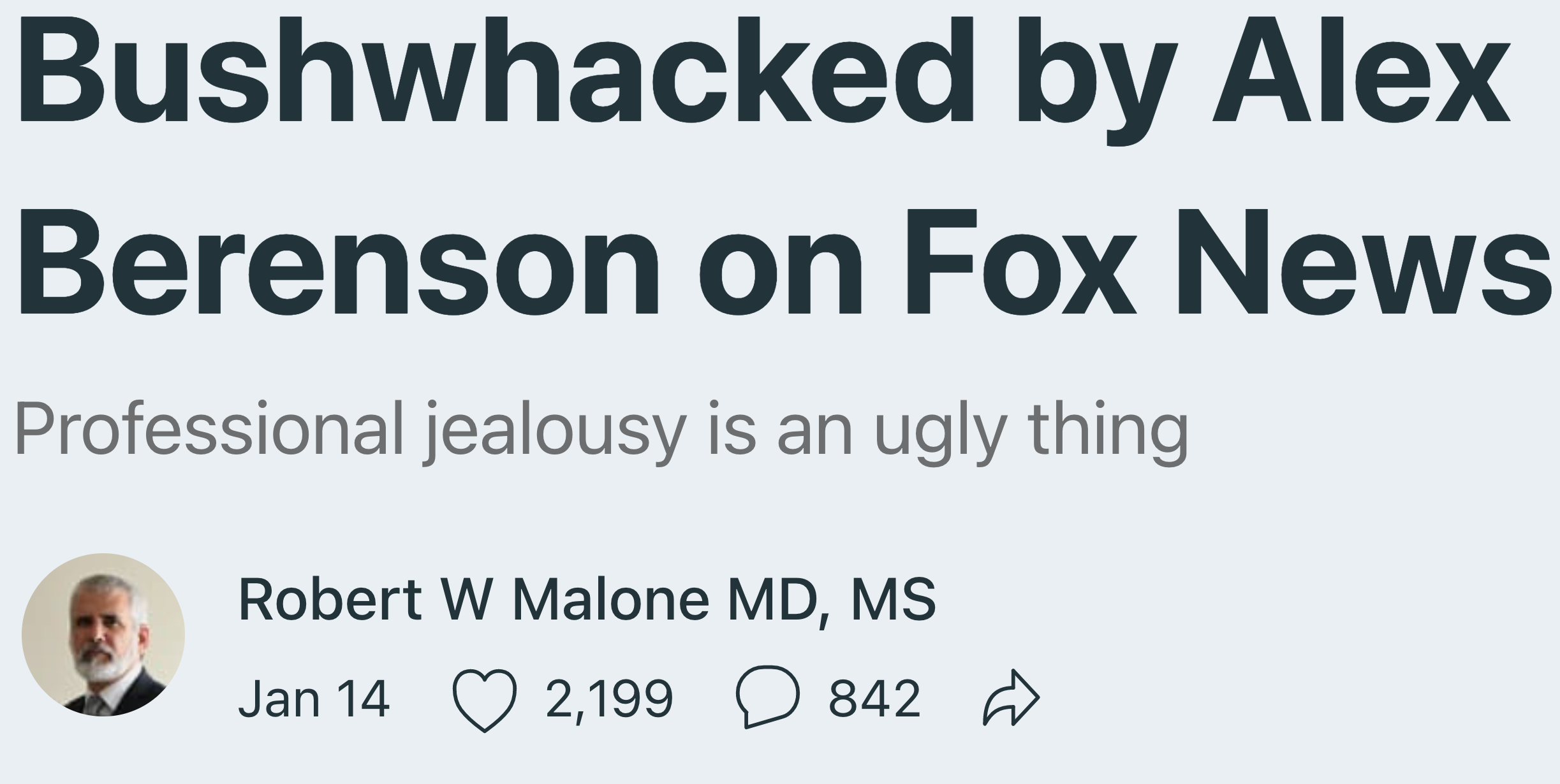 With regards to the dispute – which honestly, I don’t care about at all – Malone obviously didn’t invent modern coronavirus vaccines. What he did could be called “precursor research and development” or some other term. He did this in the 1980s and 90s, according to that SubStack post I just read, so obviously, there’s been significant development in the field since then. But I’ve never heard Malone claim anything different than that. I’m sure he’s been credited as “the inventor of coronavirus vaccines” by boomers on Facebook, but this is really a petty thing to bicker about in any context, let alone the context Berenson chose.