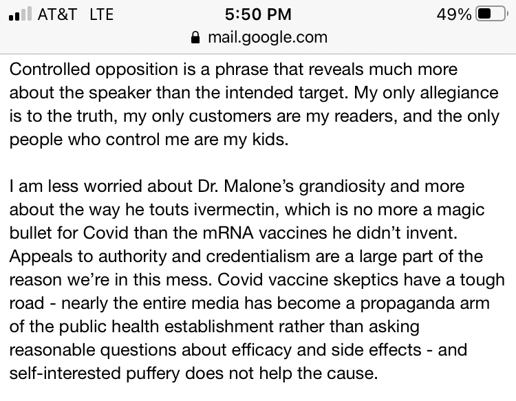 Calling Malone “self-interested” is at least as bad as calling Berenson “controlled opposition.” Malone is an old man who could just as easily retire – or better yet, be brought on regularly on CNN as an expert pushing the Fauci line. But he’s decided to do this instead.