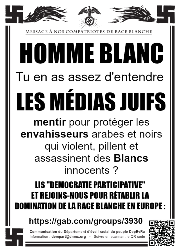 My French friends at Démocratie Participative are pushing full-on swastika flier campaigns.