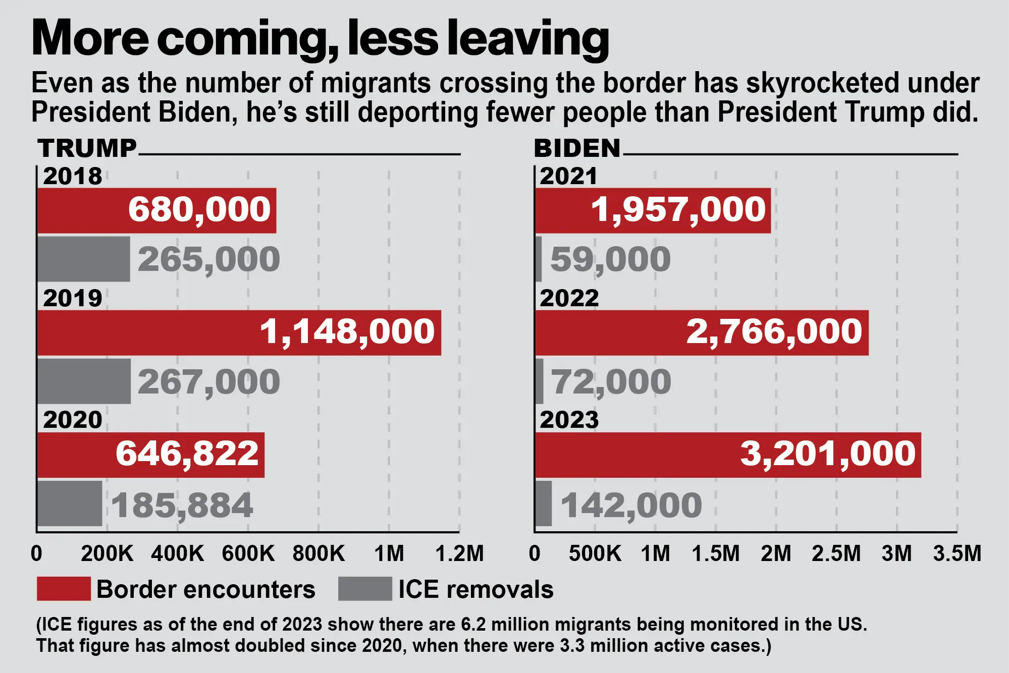 Immigration and Customs Enforcement (ICE) deported over 142,000 people in 2023 – less than 5% of all 3.2 million migrants encountered at US borders.