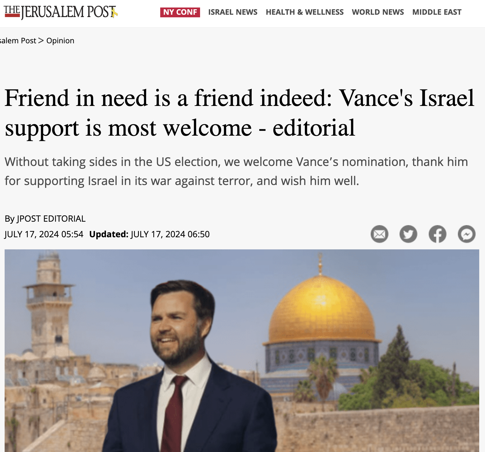 Right now he’s “JD Vance,” the Vice President Elect, servant of Israel.