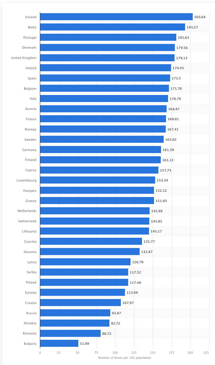 These are December 14 WHO numbers for European countries (number of shots, including double jab and boosters, administered per 100 people):