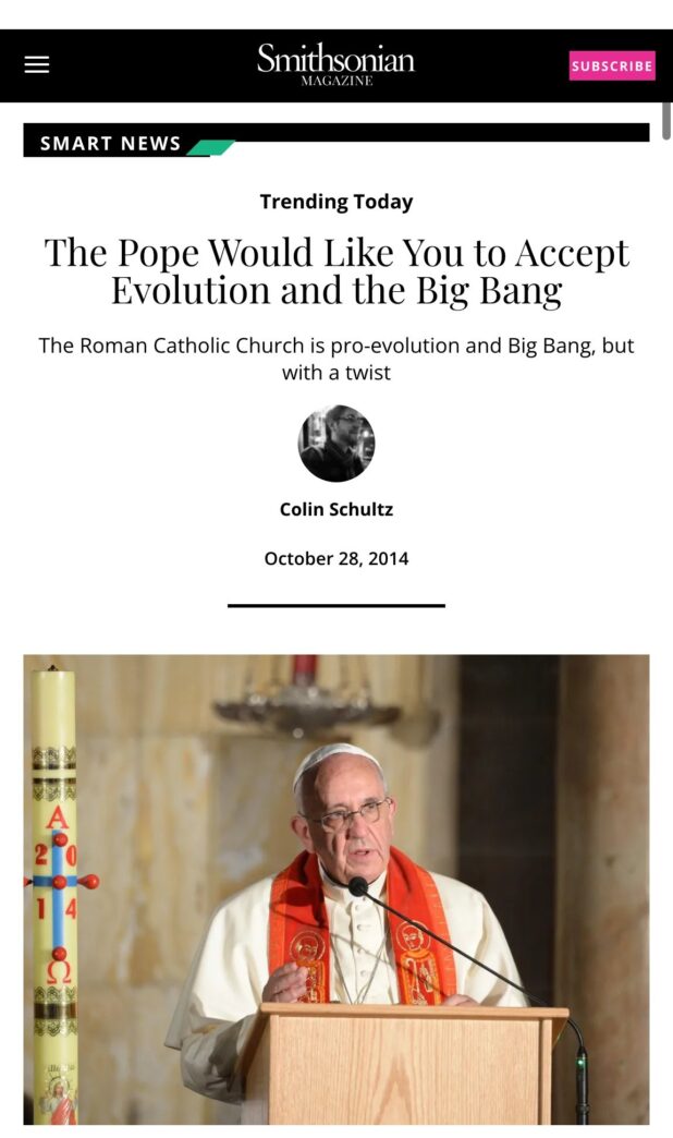 One of the first acts of Pope Francis when he began his reign of terror was to come out and say that the Big Bang and Darwinian “Animals Changing Into Other Animals” theories were actually true.