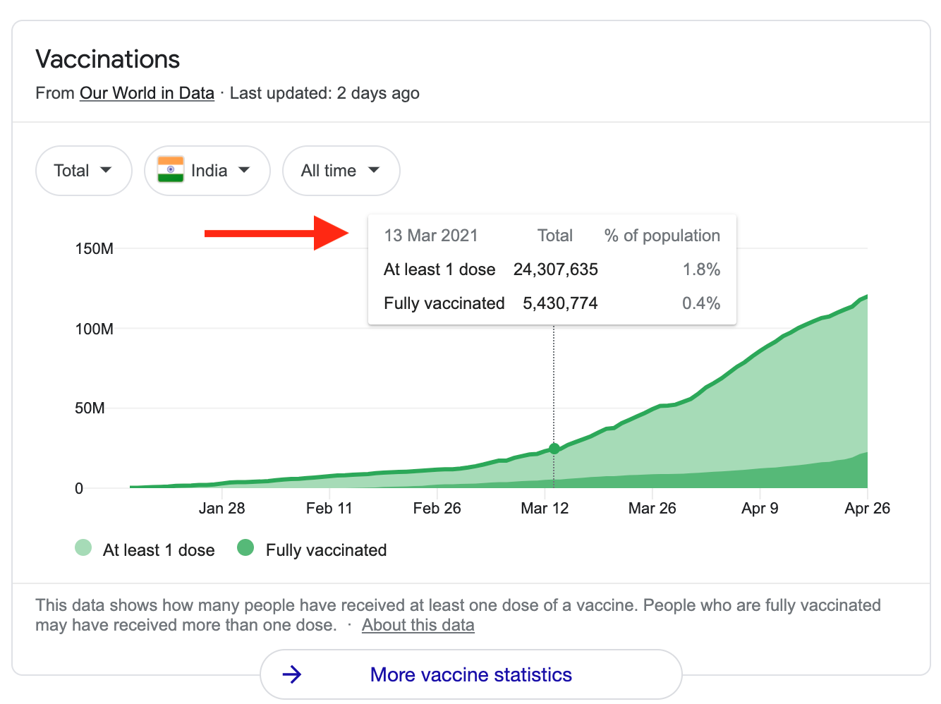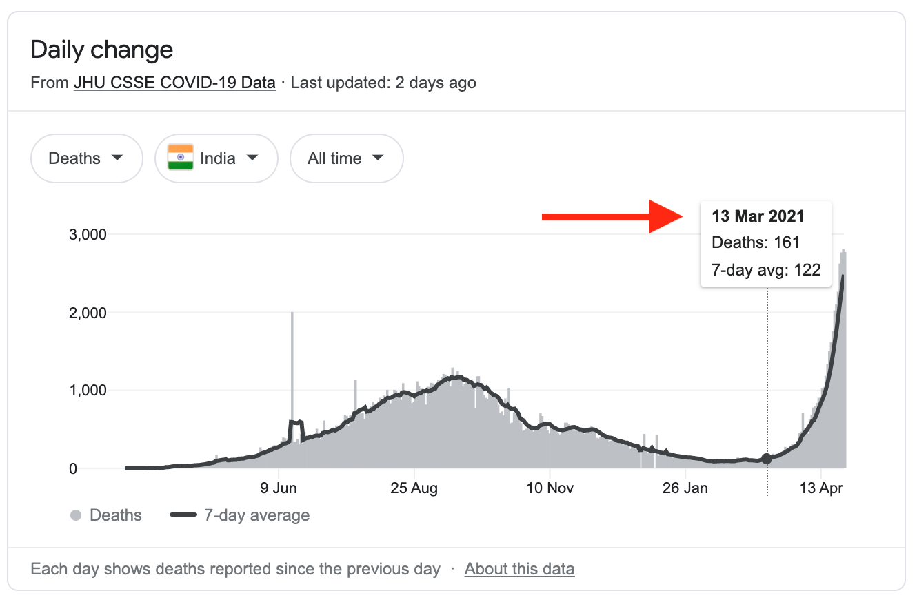 India has responded to the “COVID surge” by increasing the rate of vaccination. In theory, if the vaccine is causing the deaths, this should lead to a continued increase in deaths, and then eventually a sharp drop in deaths after most people who are willing to get the vaccine have done so.