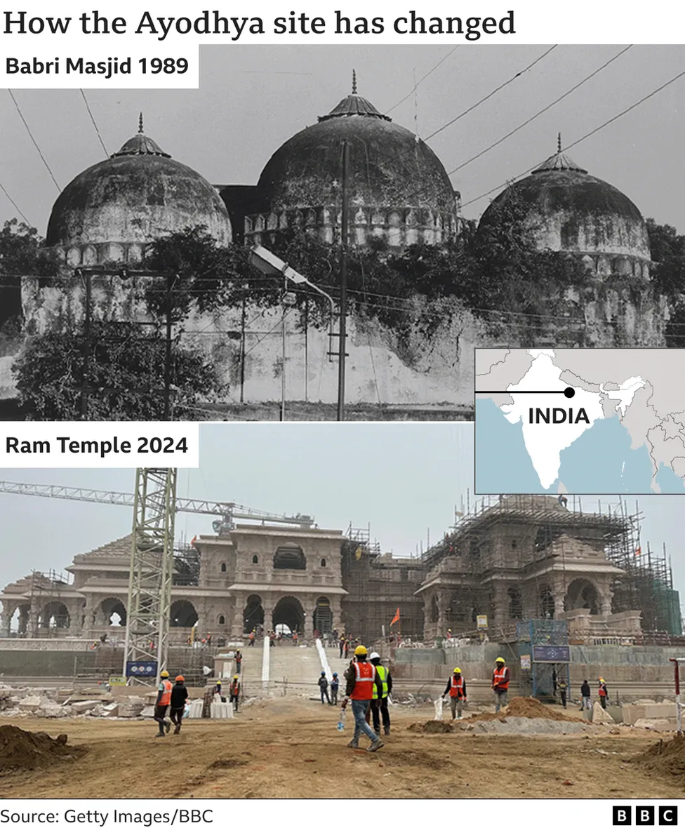 Political analysts say the destruction of the mosque boosted the BJP’s electoral fortunes. Construction of the new Ram temple began in 2020, after the Supreme Court ruled in favor of Hindu litigants. Modi himself led the foundation stone that year.