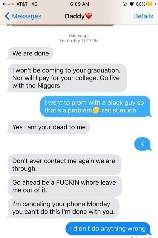 So, just to recap: father tells daughter she will be dead to him if she dates a black guy; daughter goes to prom with a black guy.
