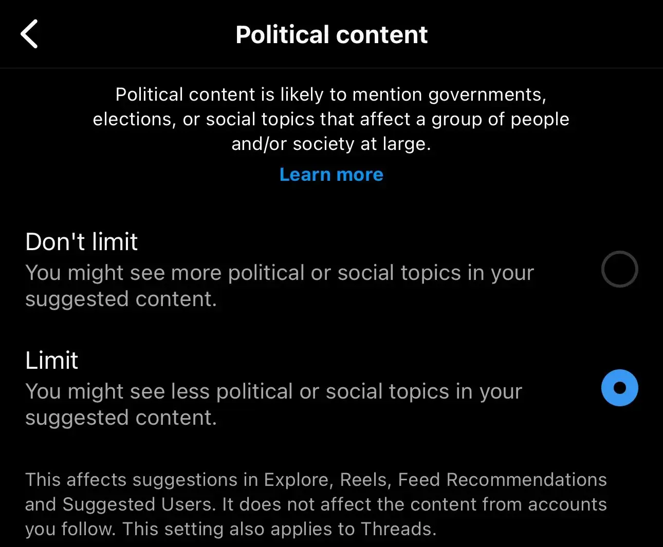 The change affects the explore, Reels, and in-feed recommendations and suggested users that Instagram shows to users. The company has stressed users will continue to see political content from the accounts users already follow.