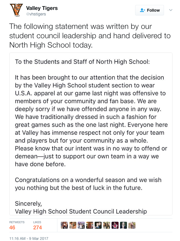 After North students and their parents took to social media, the student government at Valley High School hand-delivered an apology letter.