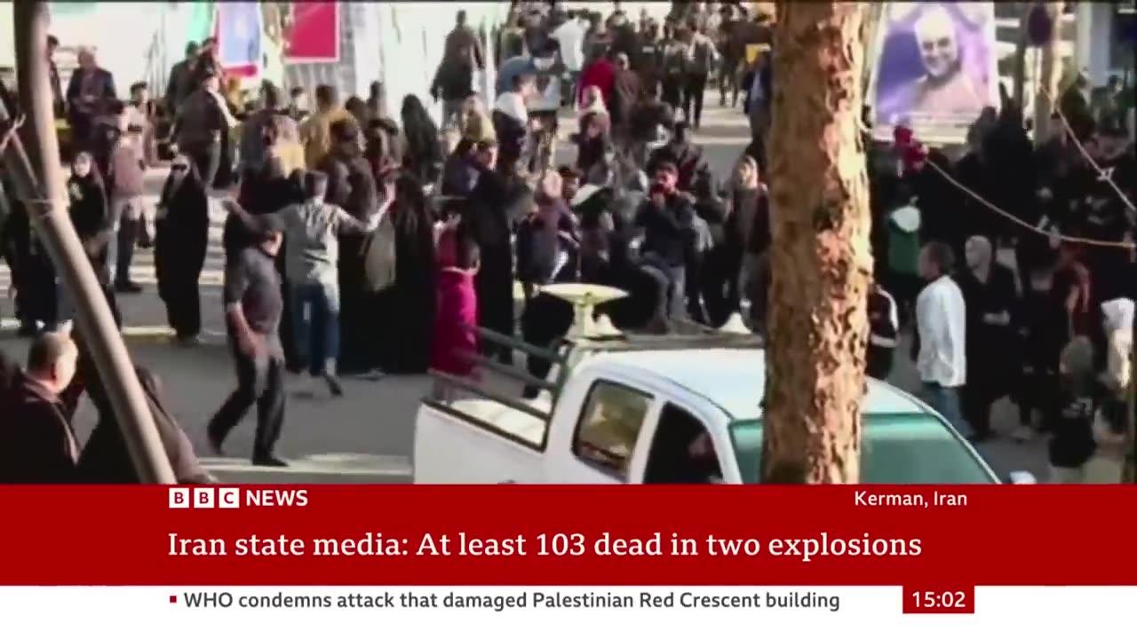 The first explosion was 700 metres away from Soleimani’s grave, and the second was a kilometre (0.6 miles) away as pilgrims visited the site, according to the Islamic Republic News Agency (IRNA).