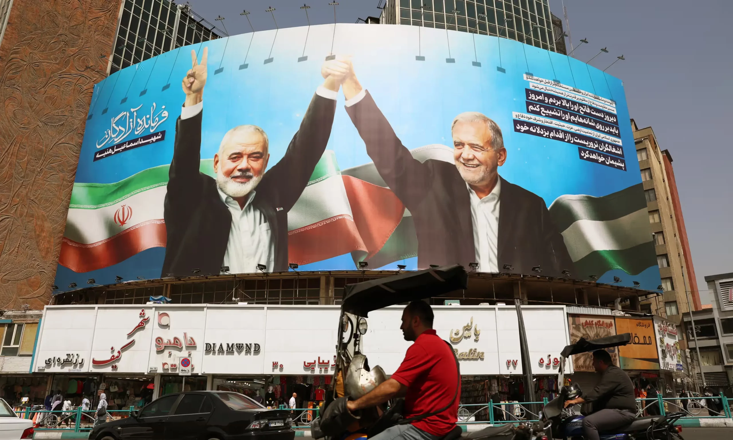 A Valiasr Square billboard put up in Tehran this week depicts the president, Masoud Pezeshkian (right), and the late Hamas leader, Ismail Haniyeh.