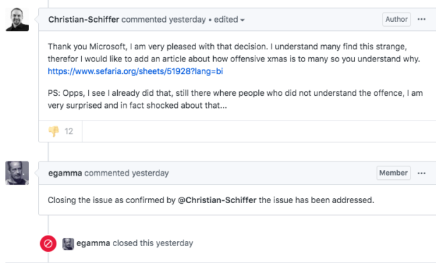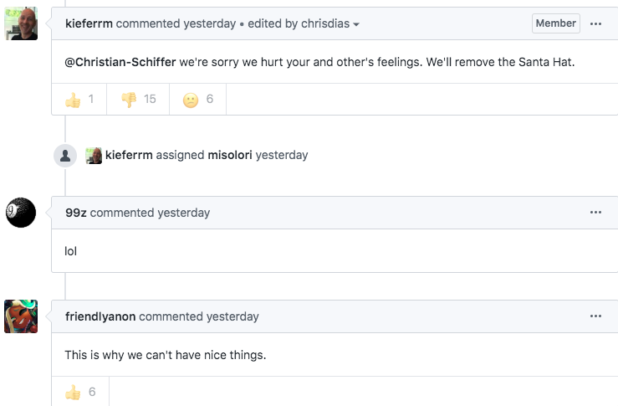 Over on Github the other day, an irate Jew single-handedly shut down the mirth and cheer for coders everywhere by complaining that the Santa Hat “cost millions of Jews their lives over the centuries” and that for that reason, it was an offensive symbol that had no place in the Microsoft community.