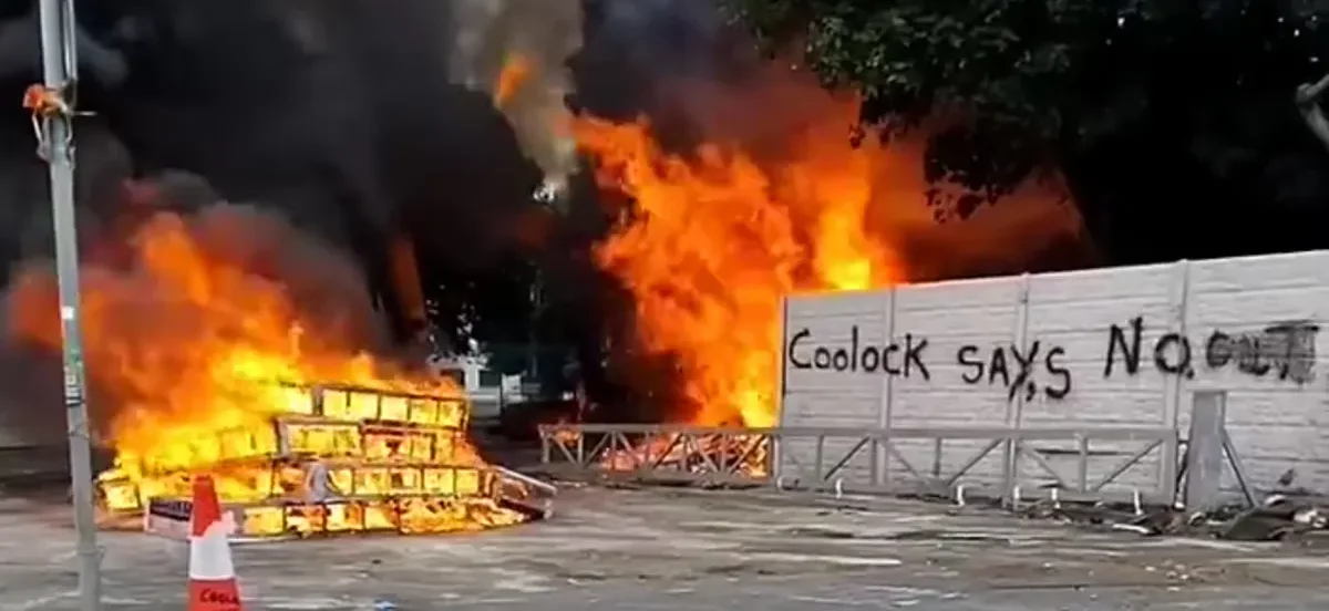 Some protestors set pallets and construction machinery alight at the former Crown Paints factory in Coolock in north Dublin, resulting in a large fire.