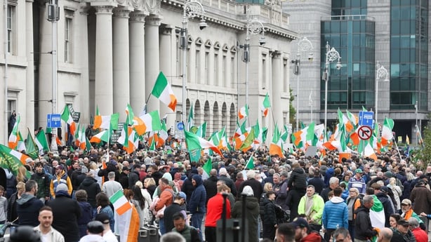 Videos and photographs from the march show a large crowd marching down OâConnell Street holding a variety of placards and signs. The crowd were also holding Irish flags, and chanted âOle, Ole, Ole, Oleâ at one point.