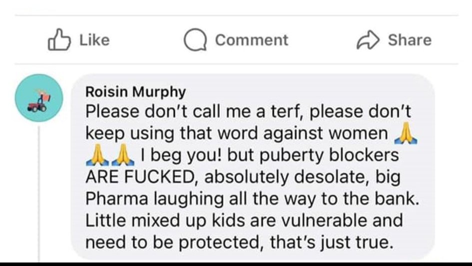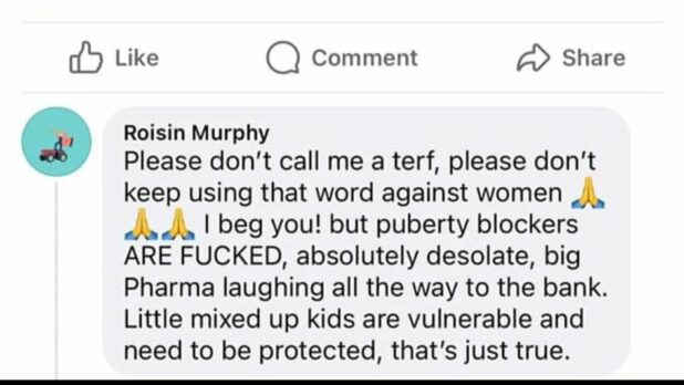 She wrote: “Puberty blockers are fucked, absolutely desolate, big pharma laughing all the way to the bank. Little mixed-up kids are vulnerable and need to be protected, that’s just true.” She pre-empted criticism, writing “please don’t call me a terf [trans-exclusionary radical feminist], please don’t keep using that word against women”.