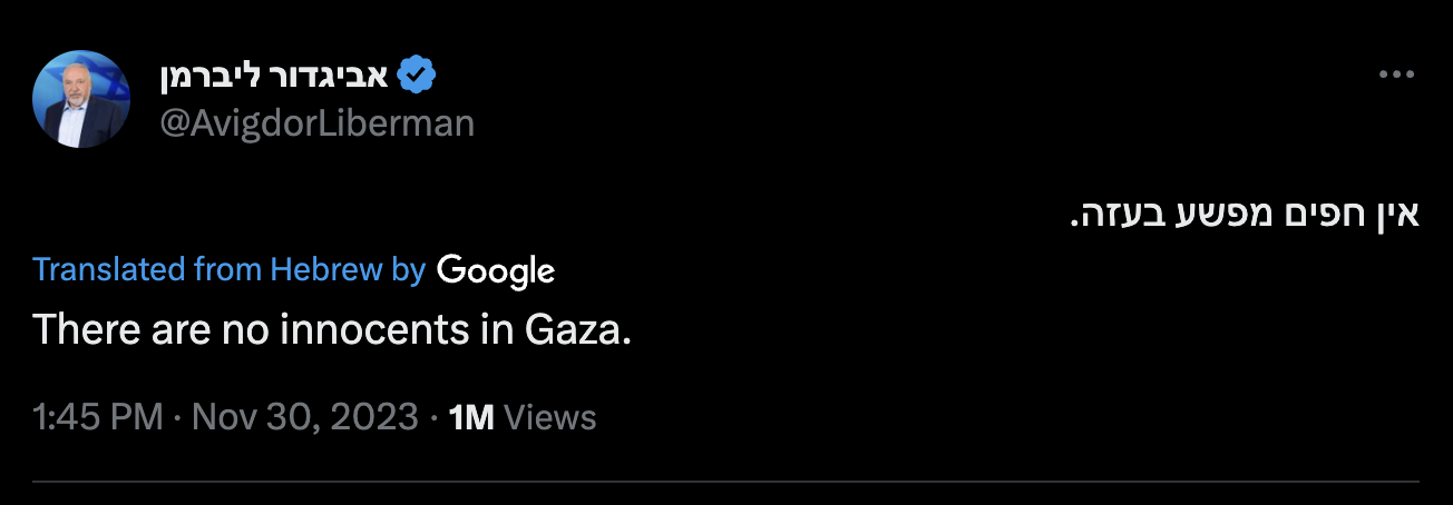 If you search Twitter or Google News for “no innocents in Gaza” or “the myth of the innocent Palestinian,” you find hundreds or thousands of results. This is a big slogan.