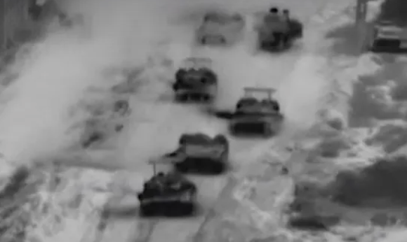 Grainy video footage released by the Israel Defence Forces (IDF) showed a column of at least a dozen main battle tanks and other armoured vehicles crossing through an opening in the Gaza border wall and firing on a nearby built-up area of damaged buildings.