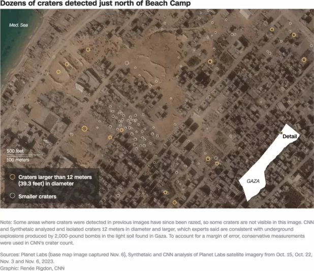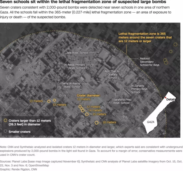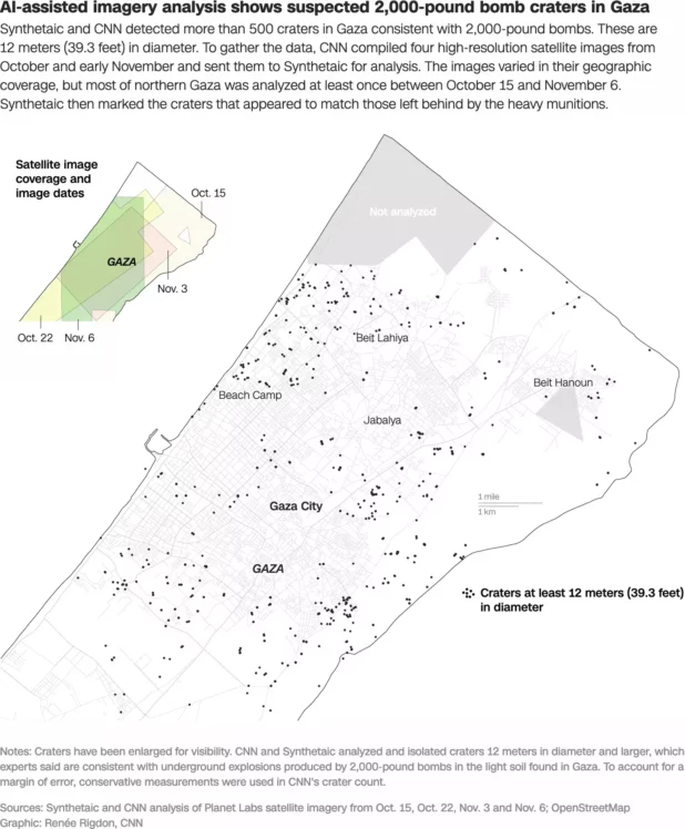 In the first month of its war in Gaza, Israel dropped hundreds of massive bombs, many of them capable of killing or wounding people more than 1,000 feet away, analysis by CNN and artificial intelligence company Synthetaic suggests.