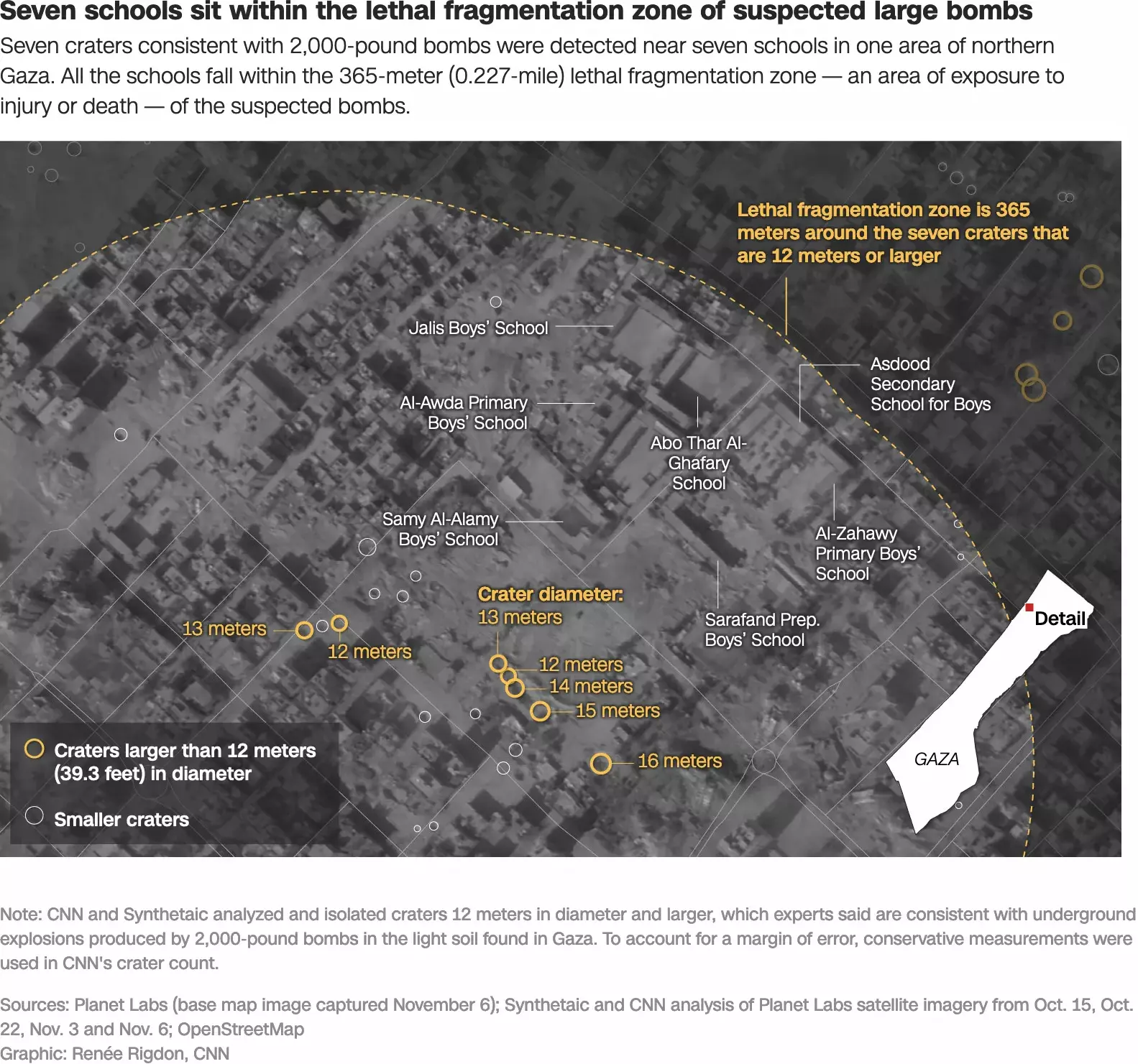 In one area near Beach camp, seven schools were within the lethal fragmentation zone of at least five craters. Satellite imagery captured on November 6 showed wide-scale destruction in the area. Those satellite images also showed Israeli armored vehicles in and around the schools.
