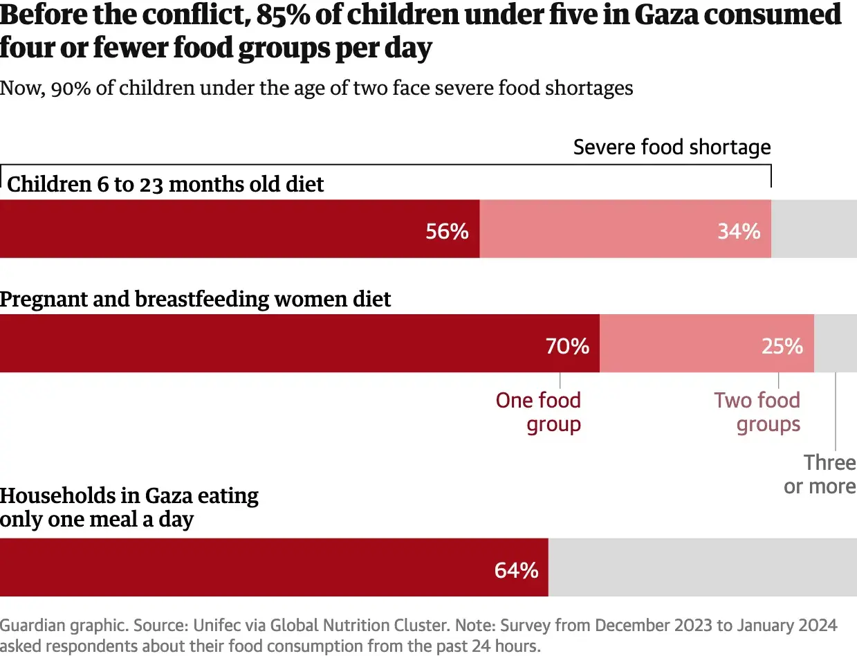 Nutrition screenings at health centers and shelters in January found almost 16% of children under the age of two – the equivalent of one in six infants – were acutely malnourished or wasting in northern Gaza, where 300,000 people are trapped with virtually no food aid being allowed in by Israel. Of these, almost 3% are suffering from severe wasting, at high risk of medical complications or death without urgent help, according to a recent UN report. Reports have emerged of parents feeding their children animal feed in hope of keeping them alive.