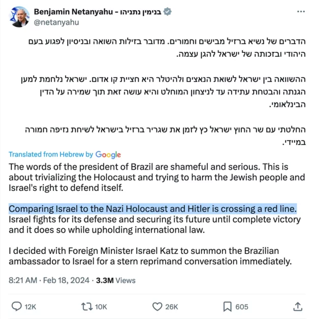 Israel said Sunday it is summoning the Brazilian ambassador to the country over what it says were “shameful and serious” remarks by Brazilian President Luiz Inacio Lula da Silva about the ongoing conflict between Israel and Hamas.