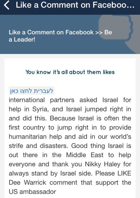 In view of Nikki Haley’s resignation as US ambassador to the UN today, it’s worth bearing in mind that in July this app instructed its Jewish minions to “Like” a Facebook comment encouraging her to run for the US Presidency in 2024.