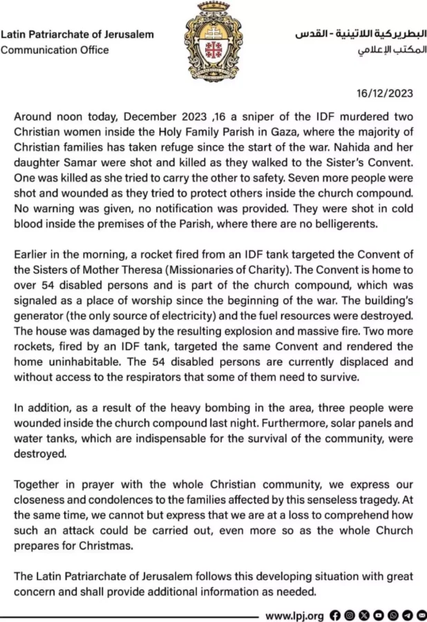 An Israel Defense Forces (IDF) sniper shot and killed two women inside the Holy Family Parish in Gaza on Saturday, according to the Latin Patriarchate of Jerusalem, which oversees Catholic Churches across Cyprus, Jordan, Israel, Gaza and the West Bank.