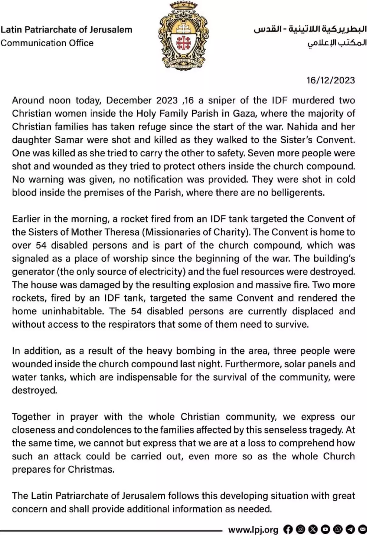 The patriarchate said that IDF tanks had also targeted the Convent of the Sisters of Mother Theresa, which houses 54 disabled people and is part of the church’s compound. The building’s generator, its only current source of electricity, as well as its fuel resources, solar panels and water tanks were also destroyed.