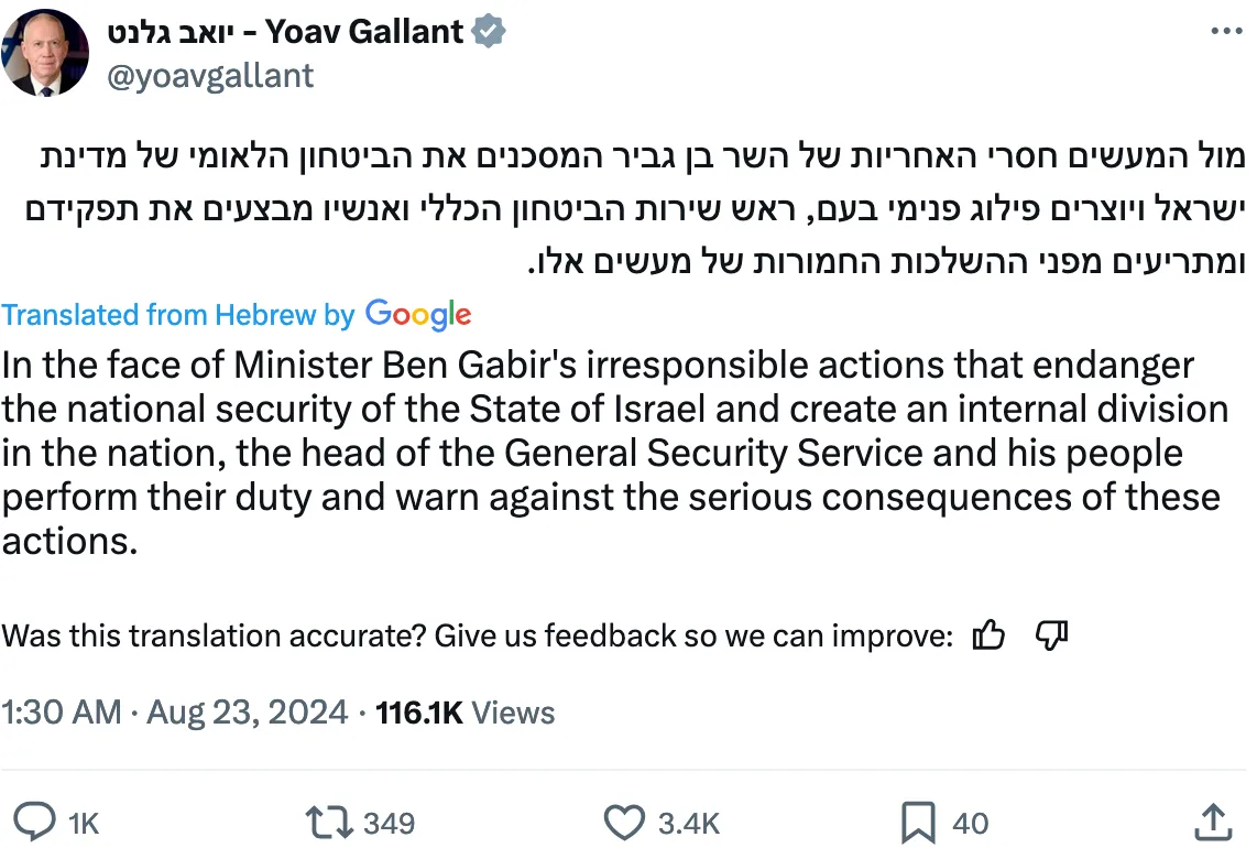 The national security minister, Itamar Ben-Gvir, one of those criticised by Bar for inflammatory behaviour, called for the Shin Bet head to be fired, triggering a rebuke on Friday from the defence minister, Yoav Gallant.
