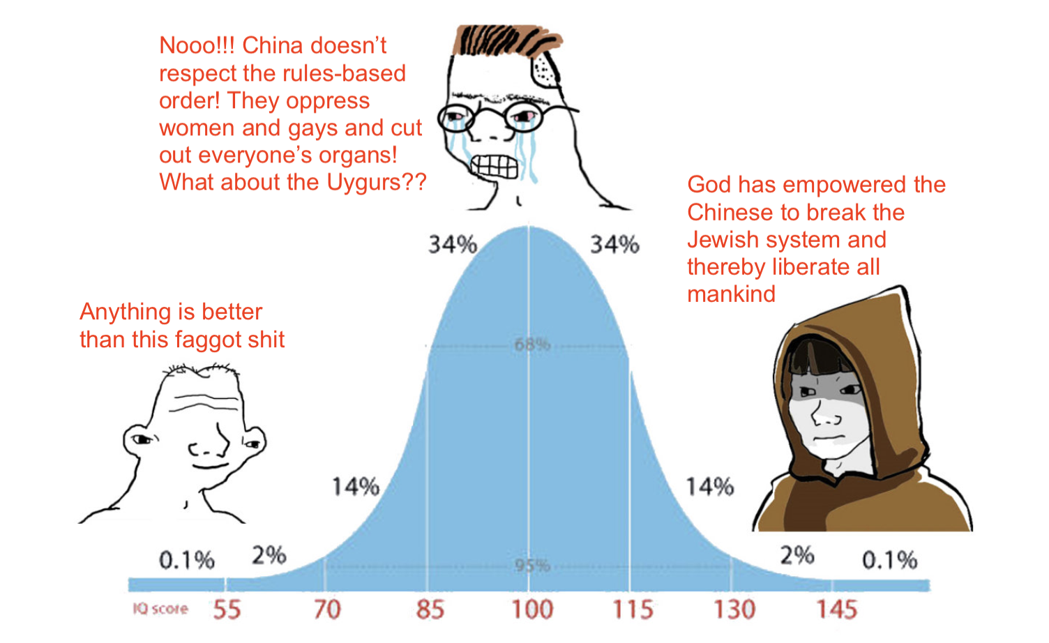 Again, this is a midwit problem. Simple people can understand that America is run by Jews who destroy families and mutilate children and that anything is better than this. More intelligent people can understand that we have thousands of years of Chinese history to observe, wherein we find that China is definitely not going to invade and occupy America to force people to do TikTok dances while they have their organs harvested by mutant bats.