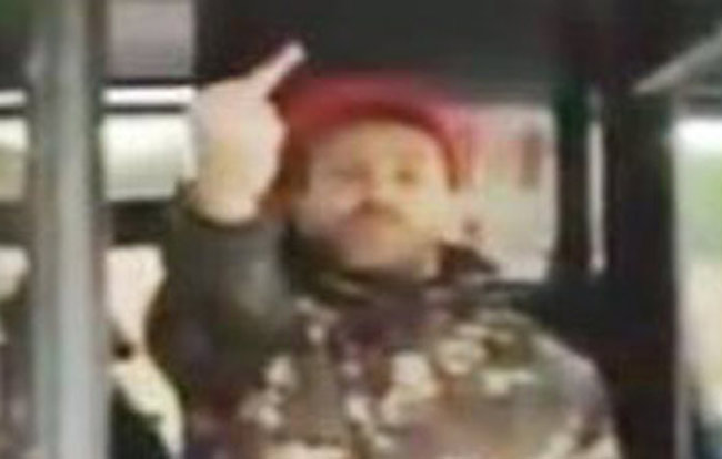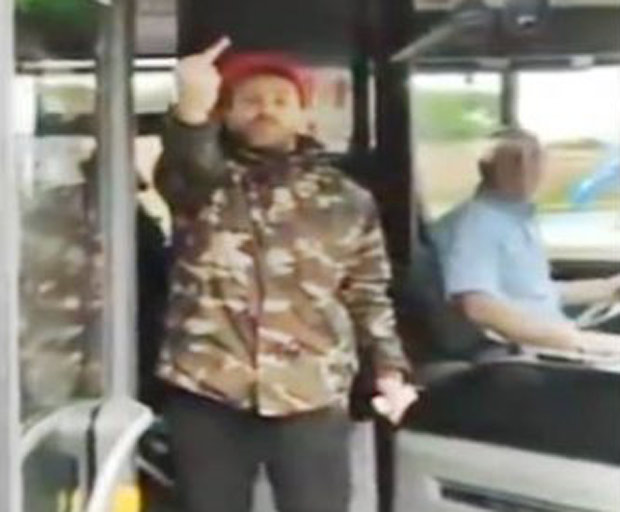 Then he lay down on the bus to avoid being arrested. When the cops tried to lift him, he started kicking them.