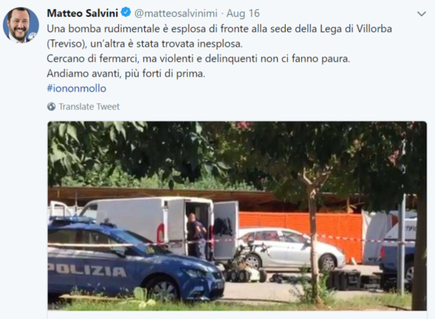 Matteo Salvini, leader of the Lega, said on Twitter “They are trying to stop us but thugs and delinquents don’t frighten us.”