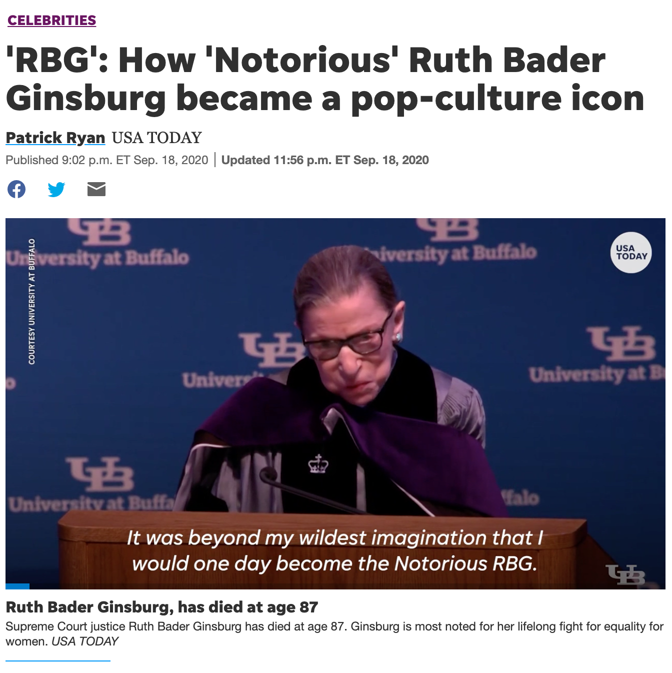 In recent years, “it seemed that her dissents had really connected with a lot of people, especially Millennials,” West said in a 2018 interview with USA TODAY. “It’s this incongruousness of a Jewish grandmother who is speaking truth to power. That took off with ‘Saturday Night Live,’ and every time you put ‘R.B.G.’ into social media, you see thousands and millions of entries. She really is a galvanizing force.”