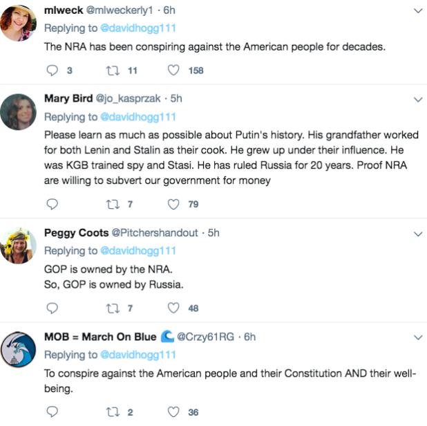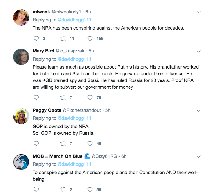 The NPCs replying to him are batshit insane. They’re really connecting all the dots from the Kremlin to the NRA to Trump here.