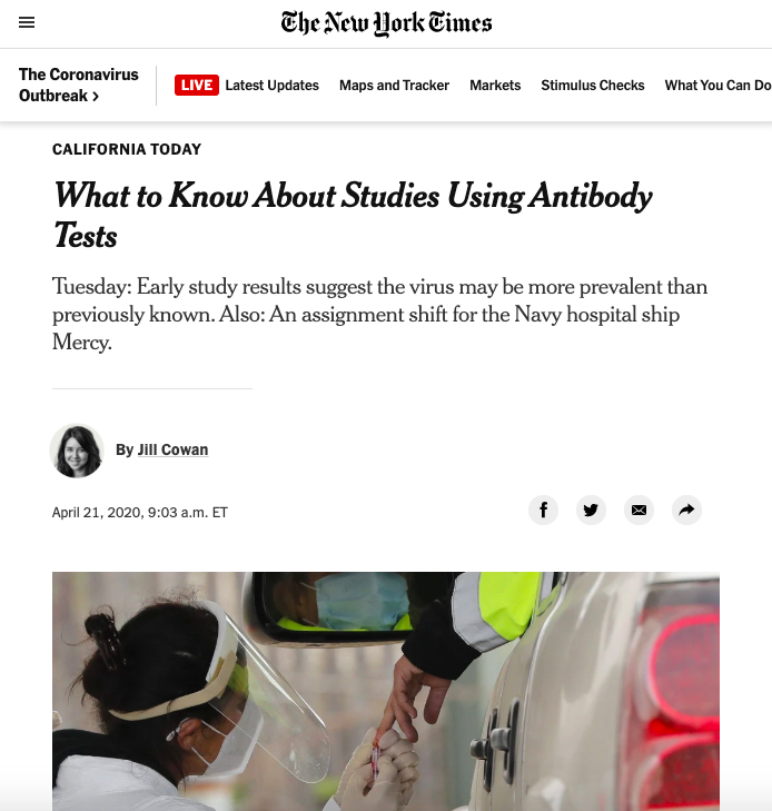 The above quoted New York Times article that first reported these numbers on Tuesday did not carry the headline “California Infection Rate Nearly 50 Times What was Claimed by the Governor” or “It was All a Hoax.” No, their headline was – no joke – “What to Know About Studies Using Antibody Tests.”