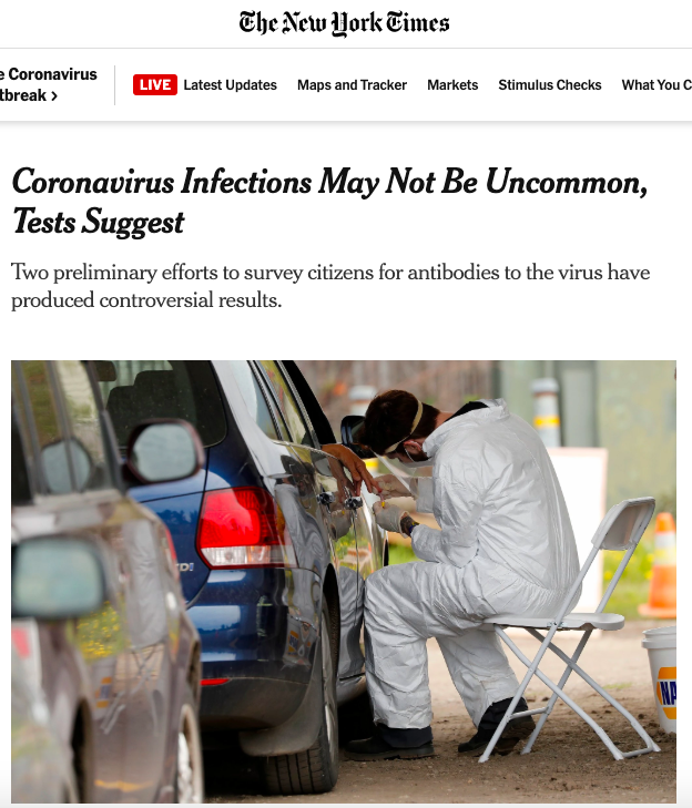 A second article on the California testing was published later in the day on Tuesday, which had the slightly more informative headline “Coronavirus Infections May Not Be Uncommon, Tests Suggest.”
