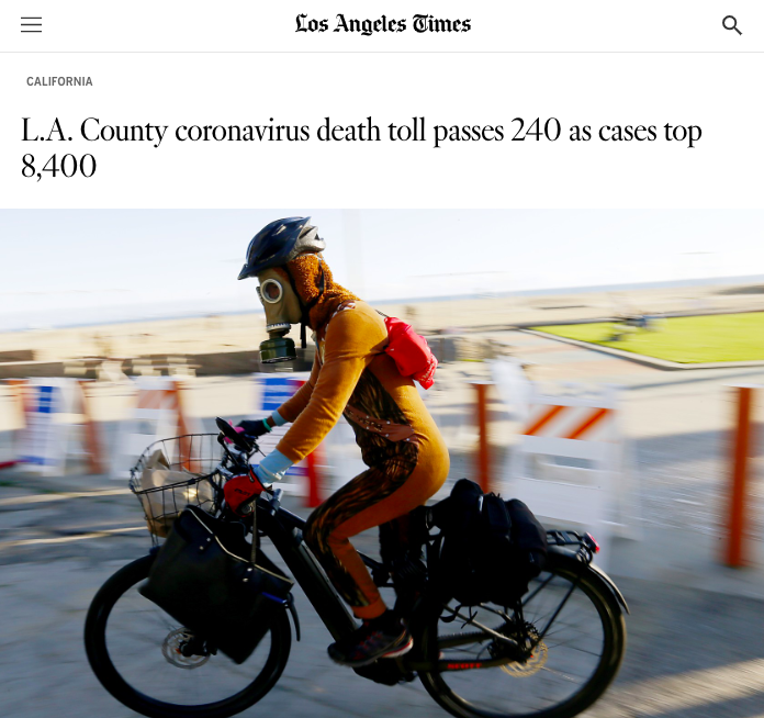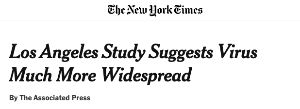 To their credit, they did syndicate the much better Associated Press headline on the story – “Los Angeles Study Suggests Virus Much More Widespread” – on their website, though it did not appear on the front page.